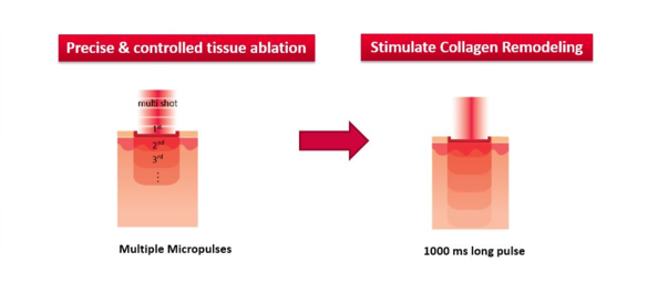 يعمل نمط النبضات الطويلة على توصيل الطاقة في زمن طويل نسبياً يصل إلى ١٠٠٠ مللي ثانية، ويحفز التسخين البطئ من تجدد الأنسجة عبر تكوين إيلاستين وكولاجين جديدين. ويساعد ذلك من تسريع التعافي، تقليص فترات النقاهة والوصول لنتائج أفضل على صعيد تجديد البشرة.