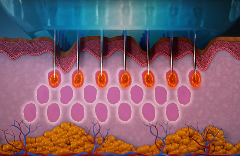• تتكون مناطق واسعة من التخثر داخل الجلد عند الوصول لدرجة حرارة  ٧٢ °س  بإستخدام زمن نبضة طويل نسبياً. وواجهت التقنيات التقليدية صعوبة في الوصول لهذه الحرارة بإنتظام في كل الأنسجة بسبب توصيلها لطاقة ثابتة لا تتجاوب مع مقاومة الجلد بالإضافة لخلوها من تقنية لقياس الحرارة فورياً داخل الجلد. وأدى ذلك لنتيجة من إثنين: إما تعديل جزئي للكولاجين عند الوصول لمتوسط حرارة ٥٥ ° س بسبب المقاومة المرتفعة للأنسجة، أو تجفيف الأنسجة عند الوصول لدرجة حرارة ٨٠ ° س بسبب المقاومة المنخفضة لبعض الأنسجة.