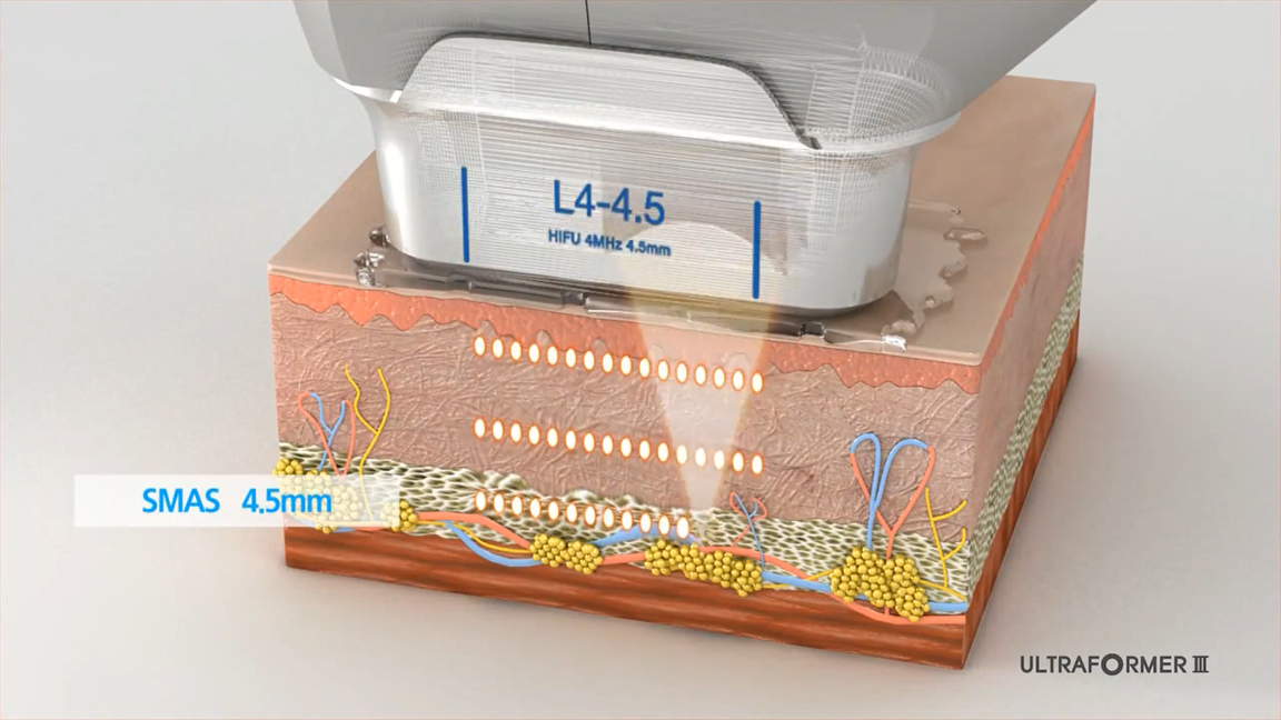 • النظام العضلي السفاقي السطحي (SMAS) الذي يربط العضلات الوجهية مع البشرة، وذلك باستخدام خرطوشة بقياس ٤,٥ ميليمتر. وتؤدي الطاقة الناتجة إلى تقلص الألياف، ما يؤدي إلى الإنطباعات الفورية عند المرضى.